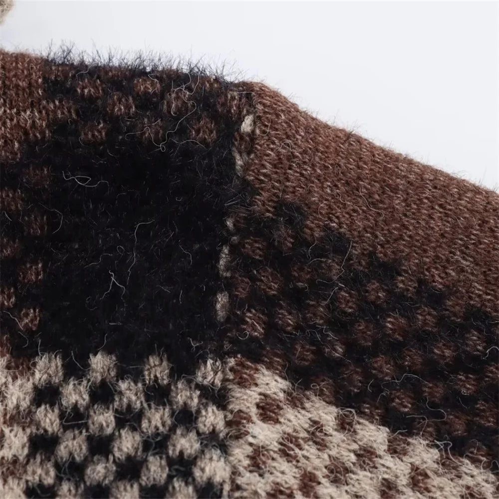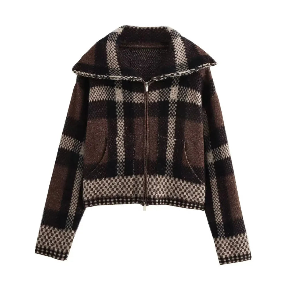 Elegant Plaid Pocket Zipper Sweater Coat for Women